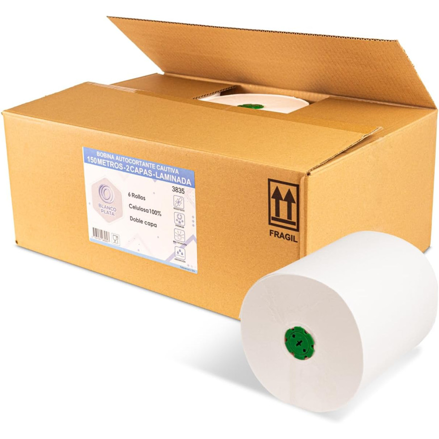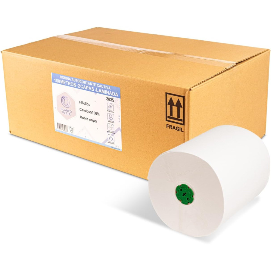 BOBINA AUTOCORTE 150M 2 CAPAS CAUTIVO BLANCOPLATA 6 UNIDADES