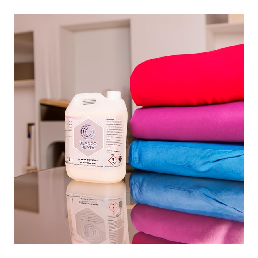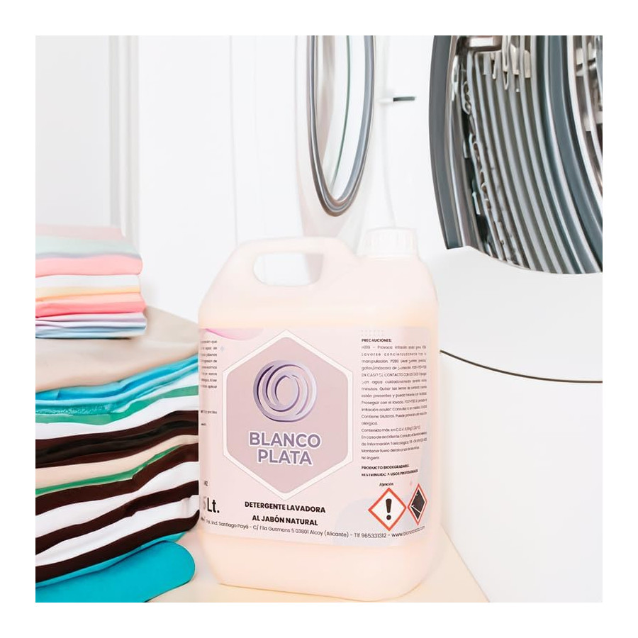 El detergente para lavadora al jabón natural Blancoplata de 5l destaca por su contenido en jabones naturale que protege los tejidos, sus enzimas son capaces de eliminar cualquier resto de comida y las manchas más difíciles. Los blanqueantes ópticos devuelven el blanco original y reavivan los colores de la ropa. De agradable perfume a jabón de marsella.